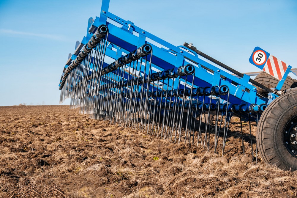Борона с пружинным зубом полуприцепная гидрофицированная тяжелая ПОБЕДА БЗГТ-19. Ширина захвата бороны - 19,5 м. Производительность 18-28 гектаров в час.