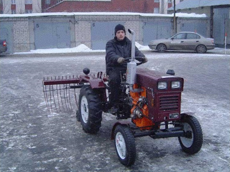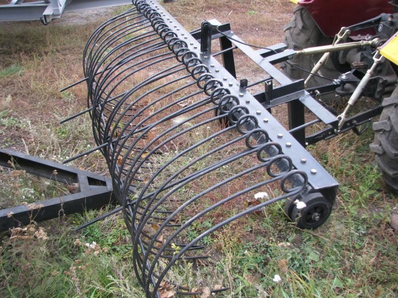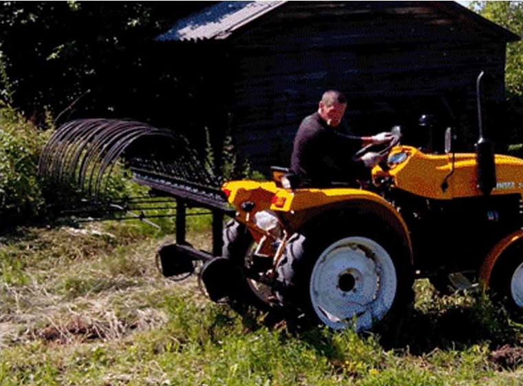 Грабли — это навесное оборудование, предназначенное для сгребания травы в валки для дальнейшего сбора, либо формирования стога. Трактор, двигаясь в продольном направлении, собирает скошенное сено опущенными грабельными зубьями, после набора необходимого объема при подъеме рычагов заднего навесного устройства сено упирается в очистительный прут, сбрасывается и образует валок.