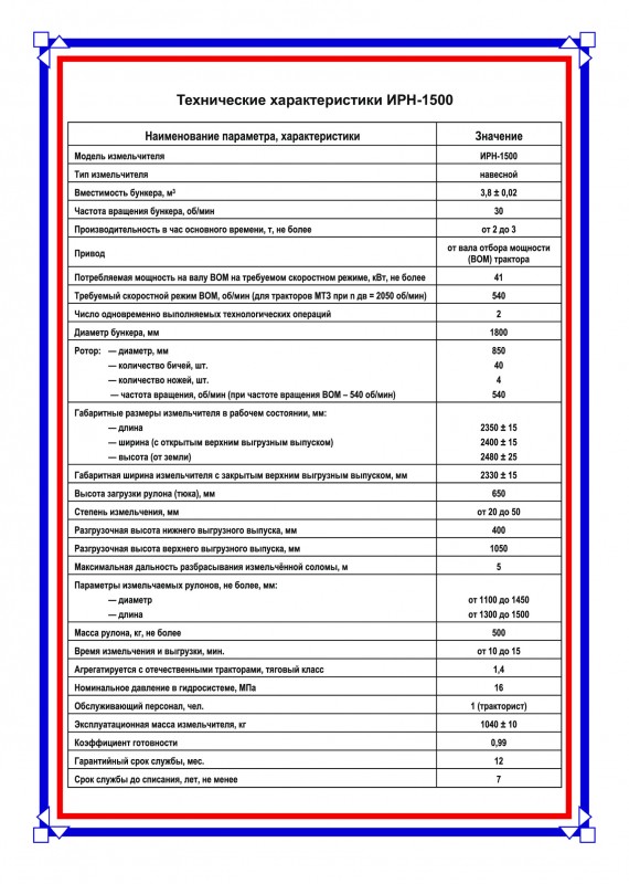 Технические характеристики навесного измельчителя рулонов ИРН-1500: